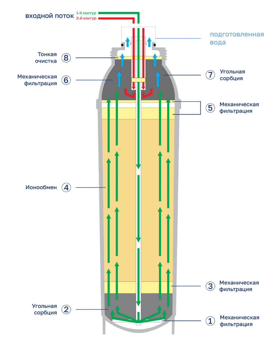 Благодаря многоуровневой системе фильтрации вода проходит полный цикл очистки: сначала удаляются крупные механические примеси, снижается жёсткость за счёт ионообменной декарбонизации, затем удаляются хлор и органические соединения и выполняется финишная тонкая фильтрация.