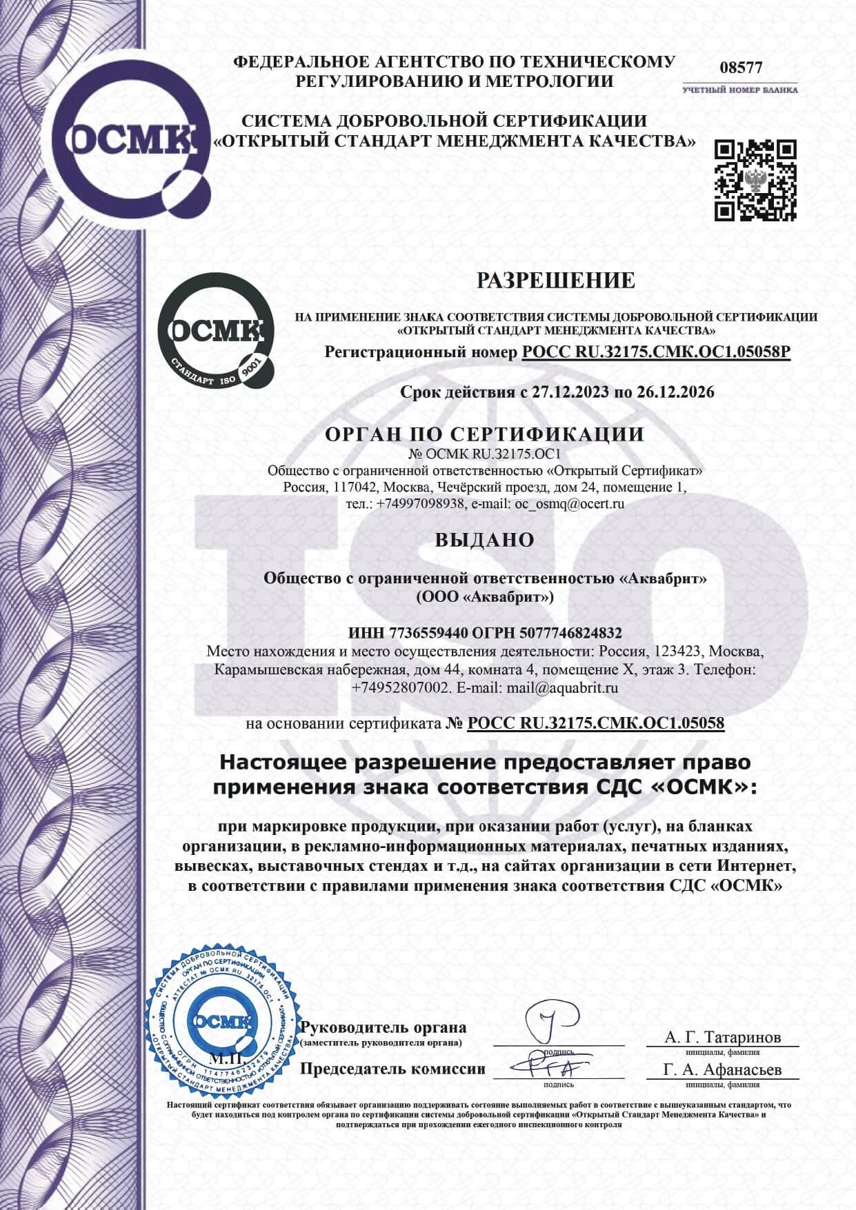 Продукция имеет все необходимые разрешительные документы: свидетельство о государственной регистрации (подтверждающее соответствие требованиям СанПиН) и сертификаты соответствия техническим регламентам Таможенного союза. Система менеджмента качества сертифицирована в соответствии со стандартом ISO 9001:2015.